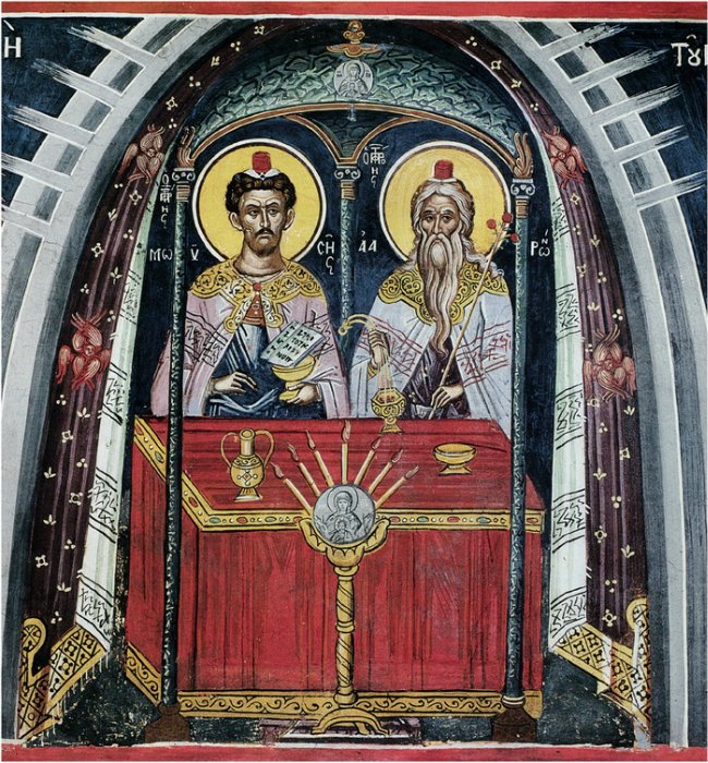 Что же скажем мы об украшении храмов Господних? Вспомним ту ветхозаветную скинию, в которой шествовал Господь Бог со Своими людьми, изведенными из Египта, в течение сорока лет в пустыне. Желая иметь для Себя эту скинию, Господь повелел Моисею, чтобы для сооружения ее каждый из народа принес что-либо по силам: золото, серебро, драгоценные камни, червленицу, виссон. А не имеющим таких драгоценных вещей, людям убогим, повелел приносить по убожеству своему то, что имеют: медь, кожу овна, червленую и синюю, и козью шерсть, каждый по своим силам. И не было в полках израилевых такого из лиц обоего пола, кто бы не принес посильной лепты на сооружение и украшение храма Господня, святой скинии, скинии собрания, как сказано в Писании: «Не только мужья, но и жены, каждый по расположению сердца приносили кольца, серьги, перстни и привески, всякие золотые вещи, и каждый, у кого была шерсть голубого, пурпурного и червленого цвета, виссон и козья шерсть, кожи бараньи красные и кожи синие» и прочее (Исх. 35, 22-23).