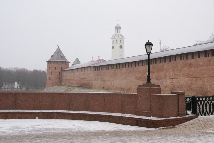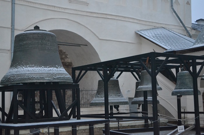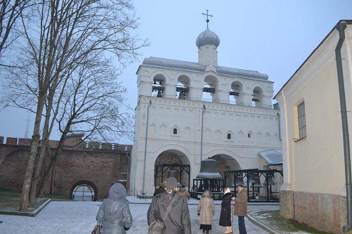 Издалека путешественники заметили знаменитую Софийскую звонницу (1437 г. - первое упоминание). Звонница возвышается над Кремлем в виде стены с пятью пролетами в верхней части. Этот тип сооружений был изобретен при новгородском архиепископе Евфимии II и повторен на Руси затем лишь дважды. У подножия звонницы — пять старинных монументальных колоколов, наверху же висят колокола современного литья. Каждый день их звон разносится далеко над городом.